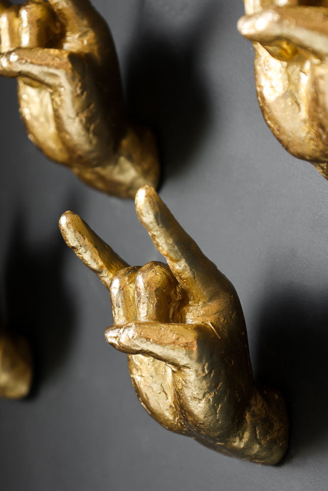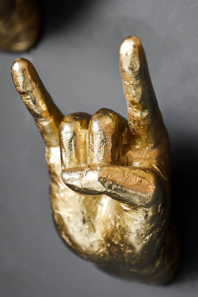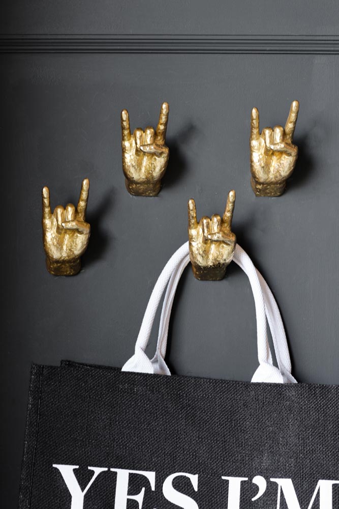 Designed to be displayed in pride of place, the Gold Set of 4 Rock On Wall Hands can be styled around your home. Place the set next to the front or back door to hang coats, hats and bags in style or introduce a couple of the rockstar hands to your kitchen or bathroom to add a touch of drama to hanging tea towels and hand towels.